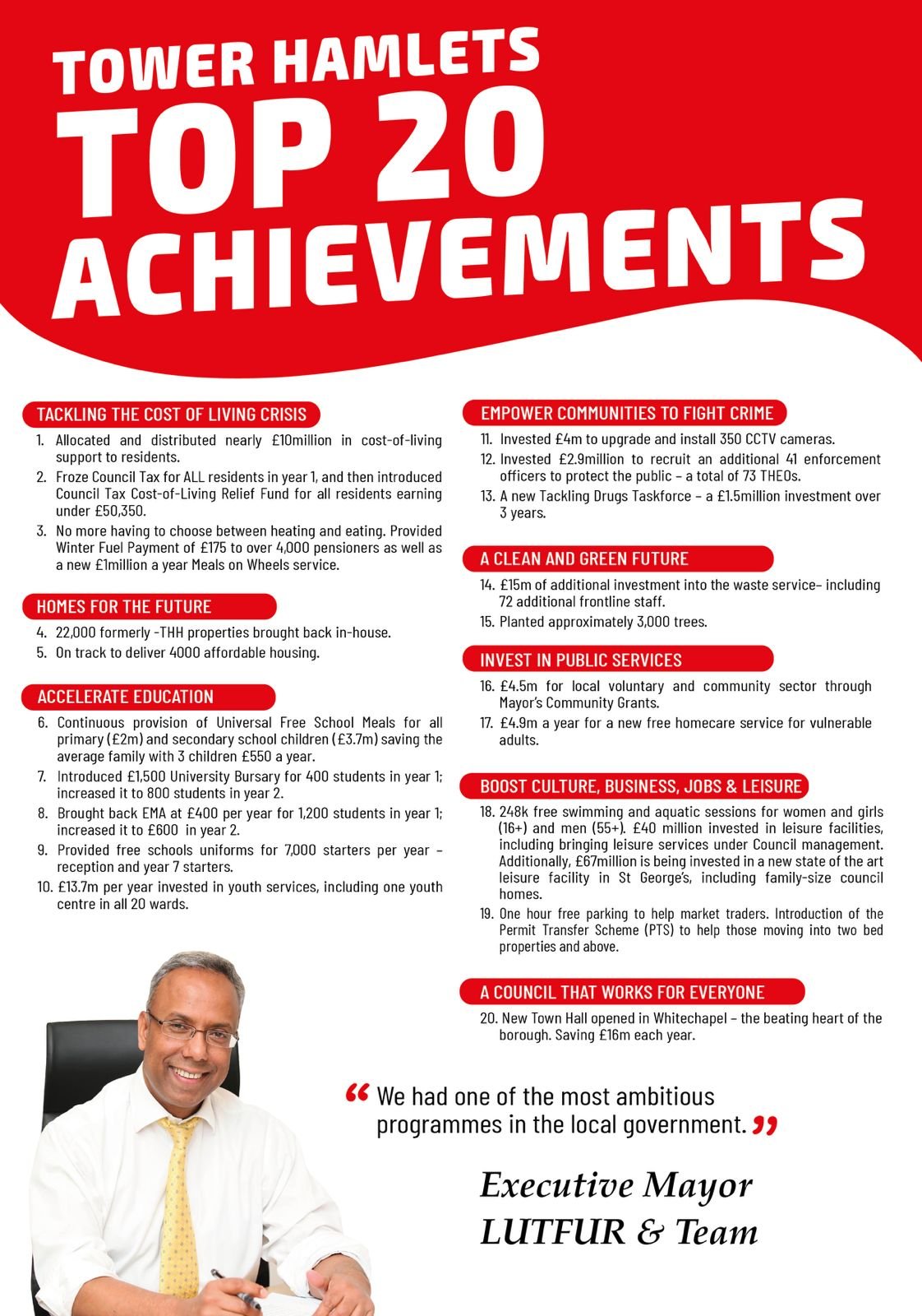 - Froze Council Tax for ALL residents in year 1, and then introduced Council Tax Cost-of-Living Relief Fund for all residents earning under £50,350.